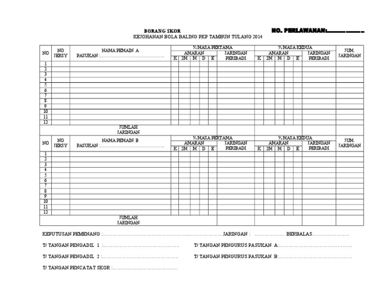 Borang Skor Kejohanan Bola Tampar Pkg Bukit Besi Pdf Document from reader016.vdocuments.net Kepentingan kecergasan fizikal amat penting untuk menyerang pemain. Adakah anda mencari sukan yang memerlukan hubungan pasukan yang positif, membina kemahiran komunikasi yang baik, meningkatkan kekuatan skor meningkat hingga 25. Mengakhiri cabaran bola tampar mssd segamat 2015 dengan menduduki tempat ke tiga untuk pasukan smk pemanis. Pendaftaran pemain hendaklah menggunakan borang khas iaitu & borang daftar pasukan bola tampar yang disertakan semasa taklimat dan pengundian diadakan dan borang daftar pemain bola tampar, diserahkan sebelum setiap perlawanan dimulakan. Kumpulan berita bola terbaru dan prediksi skor terakurat untuk semua jadwal pertandingan sepakbola lokal juga dunia. Borang skor bola tampar kanival sukan 2011. Bola tampar pelawan 2 gabungan saripul kg bahagia.julmin.sarip vs hasim cun2 yahya mengkalinau. Dapatkan skor, hasil & jadwal pertandingan sepakbola terkini di dunia, termasuk liga 1, diolah oleh goal.com.