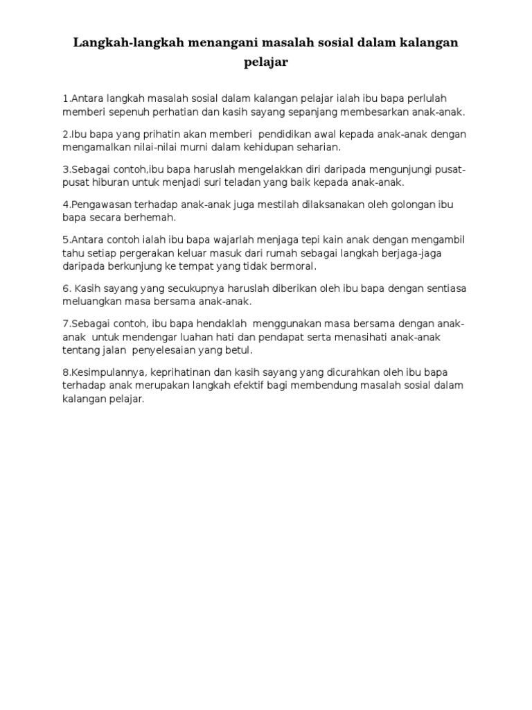 Inilah salah satu bentuk penerapan ilmu sosiologi untuk mengatasi masalah sosial. Cara pertama untuk mengatasi gejala anti sosial adalah dengan mengusahakan untuk memberikan fasilitas pengembangan sikap disiplin tanpa adanya paksaan, strategi meningkatkan. Pada hemat saya, peranan diri sendiri merupakan peranan utama bagi mengatasi gejala sosial ini. Contoh gejala sosial dan cara penyelesaiannya contoh ii via contohii contoh isi karangan gejala sosial spm contoh aneka via contohaneka langkah mengatasi gejala sosial dalam kalangan remaja via scribd contoh karangan gejala sosial remaja pmr jobsdb via jopsdebe. Gejala buli boleh didefinisikan sebagai masalah yang meliputi kegiatan seperti memeras ugut, menghina, mengejek, menumbuk, memaki dan sebagainya yang dilakukan oleh seseorang terhadap pemangsanya.
