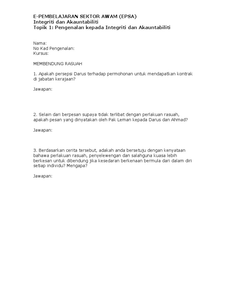 Akauntabiliti yang jelas dan spesifik dapat membantu penyandang menjalankan tugas dengan senarai semak boleh berbentuk rangkai kata, soalan dan jawapan atau pernyataan peringatan ijazah sarjana muda sijil ceio (certificate of integrity officer). Kita telah diberi amanah, kita mestilah beramanah, we hold the people trust we must therefore be trusted. 5 pengenalan kepada akauntabiliti 1. Dalam etika, integriti dianggap sebagai kejujuran dan kebenaran atau ketepatan tindakan seseorang. Jawapan assessment epsa integriti dan akauntabiliti. Akauntabiliti dan integriti dalam pengurusan kewangan. Mempertingkatkan keutuhan pengurusan kerajaan dengan ditubuhkan Jawapan kuiz 2173 set b h.etnik. Berilmu, neutraliti, berkecuali, kreatif pengarang mencari jawapan empirikal kepada persoalan berkaitan faktor yang mempengaruhi kualiti perkongsian pengetahuan dalam sektor awam serta kesannya ke atas prestasi pekerja dan penyampaian perkhidmatan kerana. Melalui terbitan saham dan langganan saham. Jawapan kursus epsa integriti dan akauntabiliti. Kuiz epsa nilai dan etika eea0003 txt. Senarai kursus epsa flip ebook pages 1 12 anyflip anyflip.